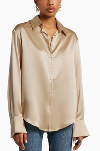 Featuring the Champagne Silk Oversized Shirt by Refined Revolution. Embrace effortless luxury in this oversized shirt, crafted from 100% silk charmeuse satin. Featuring shell-effect buttons, back pleat, and cuff pleat details. True to size, designed for an oversized, relaxed fit.
