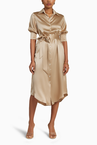 Featuring the Champagne Silk Shirt Dress by Refined Revolution. Elevate your wardrobe with this luxurious shirt dress, meticulously crafted from 100% silk charmeuse satin. Adorned with exquisite mother of pearl buttons, it offers versatility with the option to wear with or without a separate sash belt. Designed for a true-to-size, relaxed fit, exuding effortless sophistication.