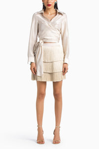The Jim Shirt comes in a high-low pattern with a longer back and shorter front that wraps around your body with a tie front detail and accentuates your waist. Hand embroidered crystals along the side of the sleeve and across the back gives it an added flair. For a sleek day-to-night look, style the shirt with a high-waisted midi skirt and metallic clutch bag.