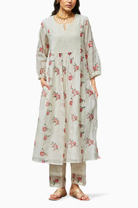 This Handwoven Chanderi Comfort-Fit Kurta Set features exquisite smocking on the yoke and lace detailing on the gathered sleeves, adding a touch of delicate craftsmanship. The kurta and trouser hemline are beautifully embellished with rose and jasmine hand block prints, enhancing the traditional aesthetic. Paired with comfortable cotton trousers, this set combines elegance and comfort, making it perfect for both casual and festive occasions.