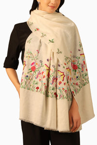 Presenting a one-of-a-kind Off white pure pashmina shawl. Chann, is adorned with a graceful butterfly pattern. This shawl is the symbol of transformation, hope, and faith which makes this Shawl the best gift for your loved ones.