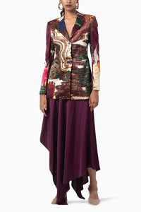 A hand embroidered blazer, structured with shoulder pads paired with an asymmetrical handkerchief skirt.