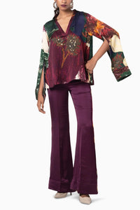 A V-neck top with cape sleeves paired with a solid flared trouser with a contrast piping detail along the side seam.