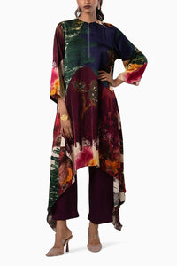 A kurta with an asymmetrical hem with kalis on the side and a front zip, paired with a solid coloured straight leg trouser.