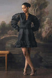 This stunning crushed organza dress features flouncy sleeves and intricate lace detailing, offering a perfect blend of elegance and whimsy. The lightweight fabric flows beautifully, creating a soft, textured look that is both sophisticated and feminine. Ideal for special occasions, its delicate lace accents add a touch of refinement to this effortlessly graceful design.