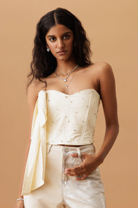 This elegant top is enhanced by delicate pearl detailing, adding a touch of sophistication. A large statement bow creates a playful yet chic focal point, elevating the overall design. Ideal for special occasions, it pairs beautifully with both skirts and tailored pants.