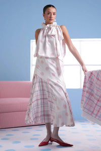 Featuring Charlotte Plaid Dot Co-ord Set by Mero's DOT collection. Crafted in luxurious silk satin, this set includes a blouson-style bowtie top in polka print, paired with a panelled flared skirt that blends plaid and polka patterns. A chic and playful silhouette perfect for elevated daywear.
