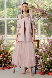 Composition: Blazer - Imported Lace ,Skirt -Tulle Crepe , Inner - Imported Lace Color: Pink Detailing: 3D Smal Flowers Highlited With Pearls And Organza Balls Components: 3 Product Code: SVEPARUSS24PT00APB