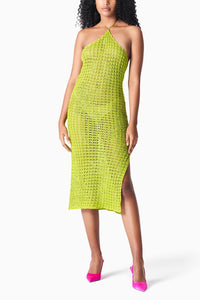 Chartreuse crochet bodycon midi dress. Features intricate hand embellished textured surface design on linen textile. The dress features a halter neck, side slit and a sleek contour fit.