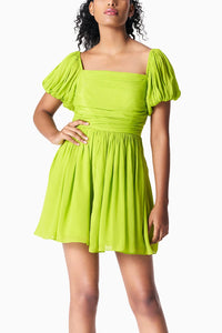 Crafted in fluid silk, this mini dress is accented sleeves . Features flattering square neckline,ruched bodice and flared skirt.