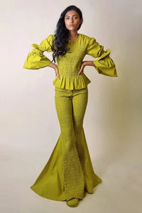 Illuminate your wardrobe with the Chartreuse Smocked Balloon Sleeve Texture Top and Flare Pants, expertly crafted from 100% cotton poplin. The playful balloon sleeves and smocked detailing create a captivating silhouette, while the vibrant chartreuse hue infuses energy into any outfit. Paired with flattering flare pants, this ensemble effortlessly combines comfort and style, making it perfect for both casual outings and special occasions. Step out in confidence and embrace your bold, fashion-forward spirit!