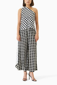 Black and white two-piece checked print set. One shouldered top in a black on white print, with draped panel flowing down the back. Can be worn as a 'sari' inspired drape detail over the shoulder, or wrapped around the neck as a scarf. Inverse white on black print, wide-legged pants with semi-elasticated waist. Side pockets.