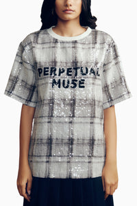 Throw on a party piece this t-shirt top is cut from lustrous georgette which has abstract check print and hand embroiderey and covered with transparent sequins.