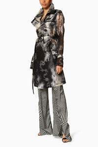 Featuring Checkmate Digital Thunder Trench by Siddartha Tytler from Checkmate Collection. Make a bold statement with the trench coat. Adorning a striking thunder-inspired print on lightweight organza, this trench coat combines dramatic visuals with a modern silhouette, perfect for adding a touch of flair to any outfit.