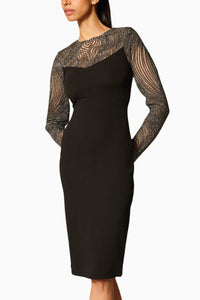 Featuring Checkmate Knit Rope Dress by Siddartha Tytler from Checkmate Collection. Stand out in the black textured knit dress, adorning a striking gunmetal crystal rope yoke and sleeves. The textured knit fabric offers a sophisticated feel, while the dazzling crystal details add a touch of glamour for a refined, eye-catching look.