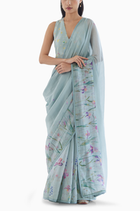 Our Cherished Times Saree is made from the finest organza mulberry silk. The intricate border print, originally handmade in watercolor, is inspired by the delicate form of the iris flower, making it a true work of art. The meticulously done hand hemming adds a touch of artistry, ensuring that every edge is flawlessly finished.