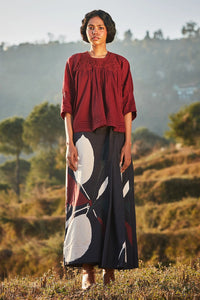 This refined earthy maroon cotton mul top features delicate lace detailing on the front, offering an effortlessly simple yet elegant look. Perfect for any occasion, it combines understated charm with a touch of sophistication. Fully lined for comfort and a polished fit, this top is a versatile addition to your wardrobe, ideal for both casual and dressier ensembles.