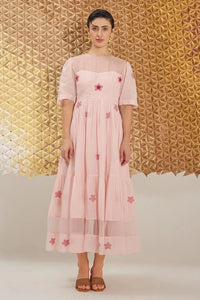 A delicate A-line dress with fluttering sleeves, reminiscent of cherry blossom petals gently falling. Crafted in a soft pink hue from handwoven cotton silk in floral Jamdani weave technique and the strategic use of Organza give the dress an airy, springtime feel, embellished with hand embroidery.