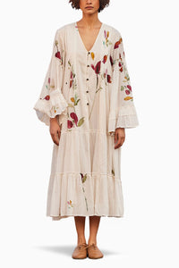 Featuring a voluminous off-white dress, crafted from breathable soft cotton mul fabric. Adorned with a delicate floral print and flared sleeves.