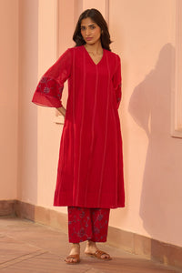 The Cherry Red Embroidered Co-ord Set is defined by refined threadwork on the kurta and voluminous sleeves accented with embroidered floral motifs. Paired with coordinating pants featuring complementary embroidery, the ensemble presents a polished and effortless look suitable for everyday wear and intimate gatherings.