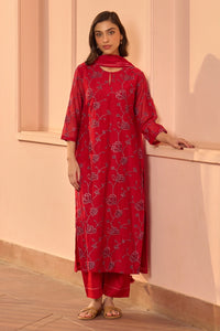 The Cherry Red Embroidered Kurta Set is embellished with delicately scattered embroidered blooms across the kurta, lending the silhouette a refined touch of detail. The ensemble is completed with matching pants and a dupatta finished with our signature tassels, creating an elegant and coordinated look.