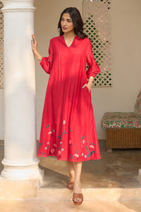 The Cherry Red Pintuck Dress showcases delicate pintuck detailing along the bodice, gracefully transitioning into a relaxed silhouette that moves elegantly with each step. Its sleeves are designed with a voluminous drape and finished with refined cuffs, while subtle applique floral motifs along the hem provide a sophisticated decorative touch.