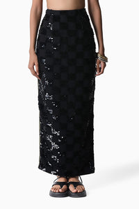 The Chess Pencil Skirt is cut in a straight pencil fit and is enhanced with hand embroidered sequins to resemble a chequered pattern in the front. The skirt has a surprise colour block at the back. It closes on the side with a concealed zip and has a slit on one side.