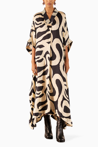 The Chestnut Kaftan crafted from our stunning Vegan Silk fabrication, trans-seasonal, is a statement piece. Made in our hand drawn Chestnut print inspired by the storm of cold winter, it is Free Size. With a V-neckline with topstitching, it is chic. Featuring kimono sleeves, this piece has small bead details and can be styled in different ways. Wear it with heels for an elegant look.