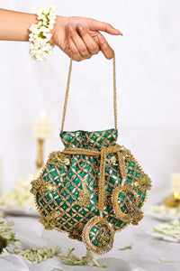 This Chetana green potli bag comes decorated with intricated gota work in floral along with detailed gold embellishments that along with its bright pink base sets it apart in its playfulness and festive vibe.