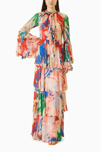 Beige And Red Abstract Prined Layered Long Dress With Layered Sleeve Detail And Neck Tie Up.