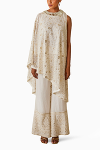 Elevate your elegance with our White Chikankari Asymmetrical Cape paired with Palazzos. Crafted from delicate Georgette, it offers a comfortable fit and timeless sophistication for your special occasions.