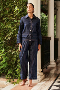 A stylish denim co-ord set featuring gold buttons, hand-smoked collar, and detailed hems on the sleeves and pants. This versatile outfit balances casual cool with refined craftsmanship, perfect for daytime events or relaxed weekend wear.
