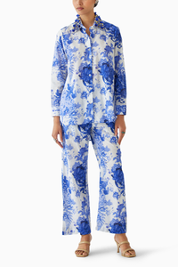 The Chintz Shirt & Trousers Co-ord crafted from our 100% cotton fabrication, trans-seasonal, is a statement piece. The Co-ord, made in our chintz print, has a relaxed fit. With a hand embroidered collar, the piece has front shell buttons and full sleeves. Featuring a summery look, it is paired with our Chintz trousers with a waistband and pockets. Wear it with heels for an elegant look.ÂÂÂ