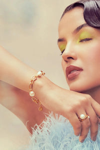 The adjustable Chroma Pearl Bracelet features a stunning combination of peach, silver, and white pearls, set on hypoallergenic brass for a secure and comfortable fit. The 22k gold-plated finish adds a touch of elegance, beautifully complementing the vibrant colors of the pearls. With its adjustable design, this bracelet offers a customizable fit for any wrist size, making it a versatile accessory for any occasion.