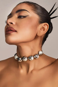 Minimal with a bold twist. The Chrome Dune Choker features radiant white manufactured pearls on an adjustable hypoallergenic brass base with a polished chrome finish. A standout piece designed for modern elegance.