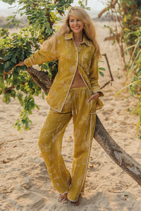 A coordinated shirt set crafted in Printed Linen featuring the Ciao Sugar print in Mauve and Green. The relaxed button-down shirt with full sleeves pairs seamlessly with mid to high waist boot-cut pants, creating a breathable, effortless silhouette perfect for versatile day-to-evening wear.