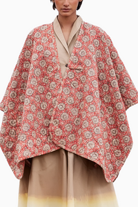 A red orange floral print reversible mul quilted cape with a front button opening.
