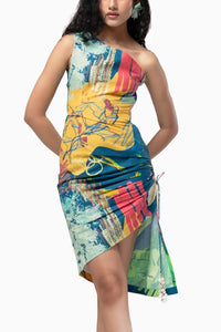 A fitted one shoulder dress with an asymmetrical hem and ruching at the side. Shell tassels added at the string. Please note, as these shells are delicate, rough use may cause them to break. In case they do, please feel free to reach out to us as we would be more than happy to stitch them back in for you!