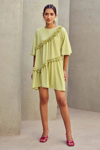 Here's unveiling a lovely light green crinkle lycra dress featuring delicate frill details and a flowy silhouette perfect for casual gatherings, brunch dates, or everyday wear.