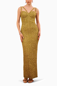 Featuring the Cinzia Pencil Dress by House of Exotique. This dress boasts a sweetheart neckline, pencil fit, and a slit at the back, with a zipper fastening for easy wear. Corset structure inside detailing and padding, it offers a tailored fit in captivating chrome yellow, crafted from lurex fabric.