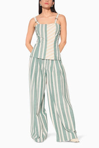 The Cion Top Set features breezy, wide-leg summer pants paired with a stylish top, creating a relaxed yet chic ensemble perfect for warm-weather days and effortless elegance.