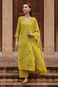 The Citrine Bloom Embroidered Kurta Set features embroidered blooms in playful hues scattered across the kurta and sleeves. Paired with coordinating pants and a dupatta adorned with applique blooms and signature tassels, it creates a breezy, festive-ready ensemble.