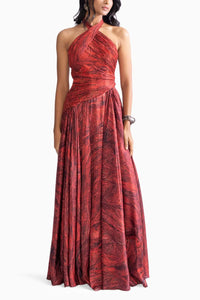Featuring Clara Red Dress by Saaksha & Kinni from Botanica Collection. Elevate your style with this wave print halter neck dress, showcasing a hand micro pleat fitted bodice and a flared skirt. Perfect for making a chic and elegant statement at any event.
