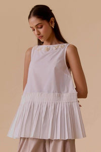 Everyone needs an everyday sleeveless number as the termperatures rise, and this season the Clara top is our version of it. It features flattering pleates at the waist and handembroidered details at the neckline.