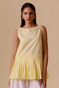 Everyone needs an everyday sleeveless number as the termperatures rise, and this season the Clara top is our version of it. It features flattering pleates at the waist and handembroidered details at the neckline.