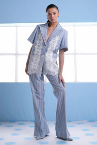 Featuring Clarissa Blue Lace Blazer with Pants by Mero's DOT collection. Tailored in cotton with intricate lace patchwork, this co-ord set includes a blue striped blazer adorned with delicate lace embroidery, paired with matching pants. A refined blend of structure and femininity for elevated day-to-evening wear.