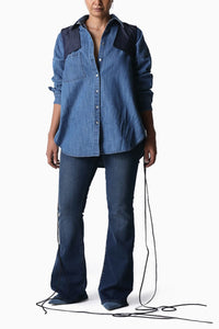 Your classic denim shirt has taken up a notch. The overlay Den Shirt is a relaxed fit shirt featuring a detachable denim overlay worn over the shoulders. The denim overlay can be styled over your other t-shirts and shirts as well. The shirt has long sleeves with buttoned cuffs. Wear it with your favorite denim for a cool denim-on denim look.