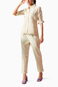 Boho Chic's shirt and pant is decidedly glamorous and will elevate relaxed summer ensembles. This shirt has detailing of embroidery and cutwork and features mother of pearl buttons. Its crafted in cotton with a classic cutwork detailed collar, slight puff on the shoulders and elbow length smoked sleeves.