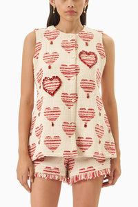 Step into statement style with the Heart Jacquard Jacket and Shorts Set, a playful yet sophisticated ensemble bursting with detail. The jacket, crafted from richly textured heart jacquard fabric, features a standout highlighted heart motif and drop embellishments for a romantic, eye-catching effect. Paired with matching heart jacquard shorts, adorned with woven fringes and 9 carefully placed stone embellishments, this set delivers a bold mix of texture, shine, and emotionâ€â€Âperfect for those who wear their heart on their sleeve and their style on full display.