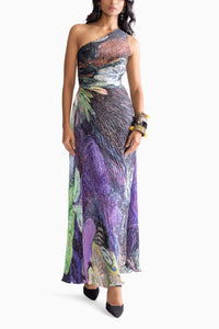 Featuring Cleo Multi Dress by Saaksha & Kinni from Botanica Collection. Step out in style with this daisy print one shoulder hand micro pleat maxi dress. Adorning elegant pleats and a chic side keyhole detail, this dress combines modern flair with a floral touch.